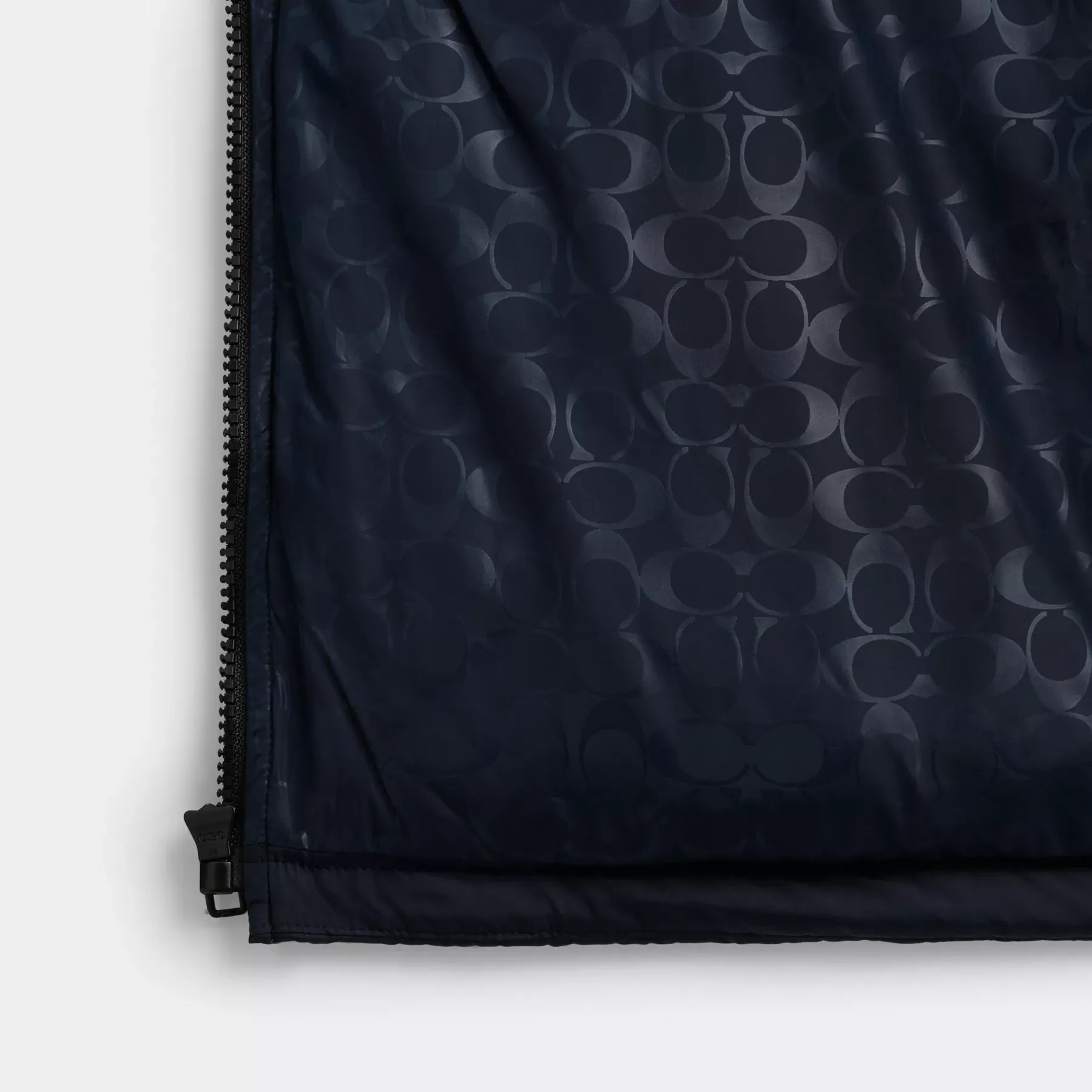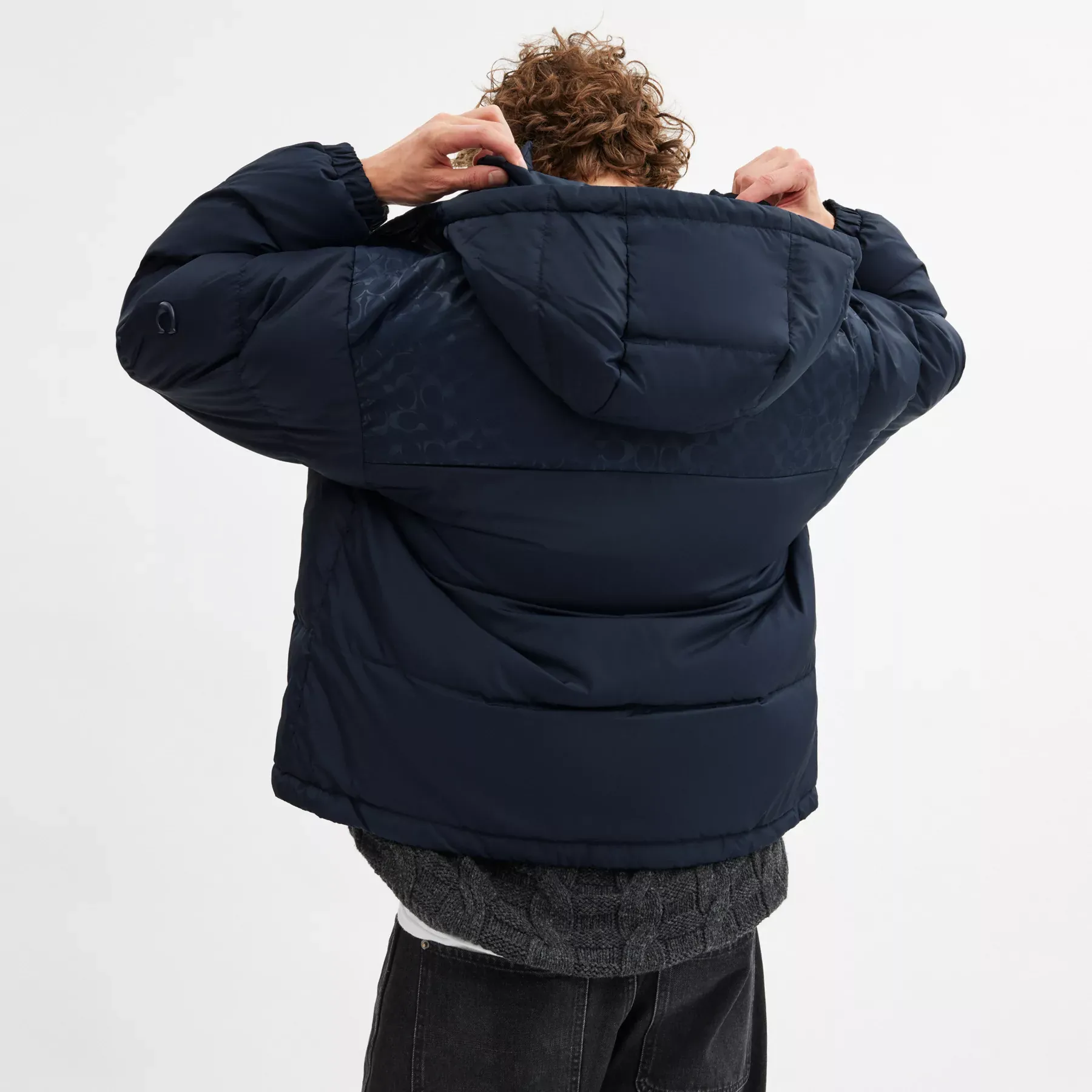 ,Detailed with a tonal Signature yoke and our name embroidered on the sleeve for subtle heritage style, this puffer jacket has a pillowy down fill and a protective funnel collar for extra warmth. Crafted of recycled polyester inspired by our commitment to rethinking and reducing our impact on the planet, the zip-front style features zip pockets for stowing small essentials and a detachable hood.
