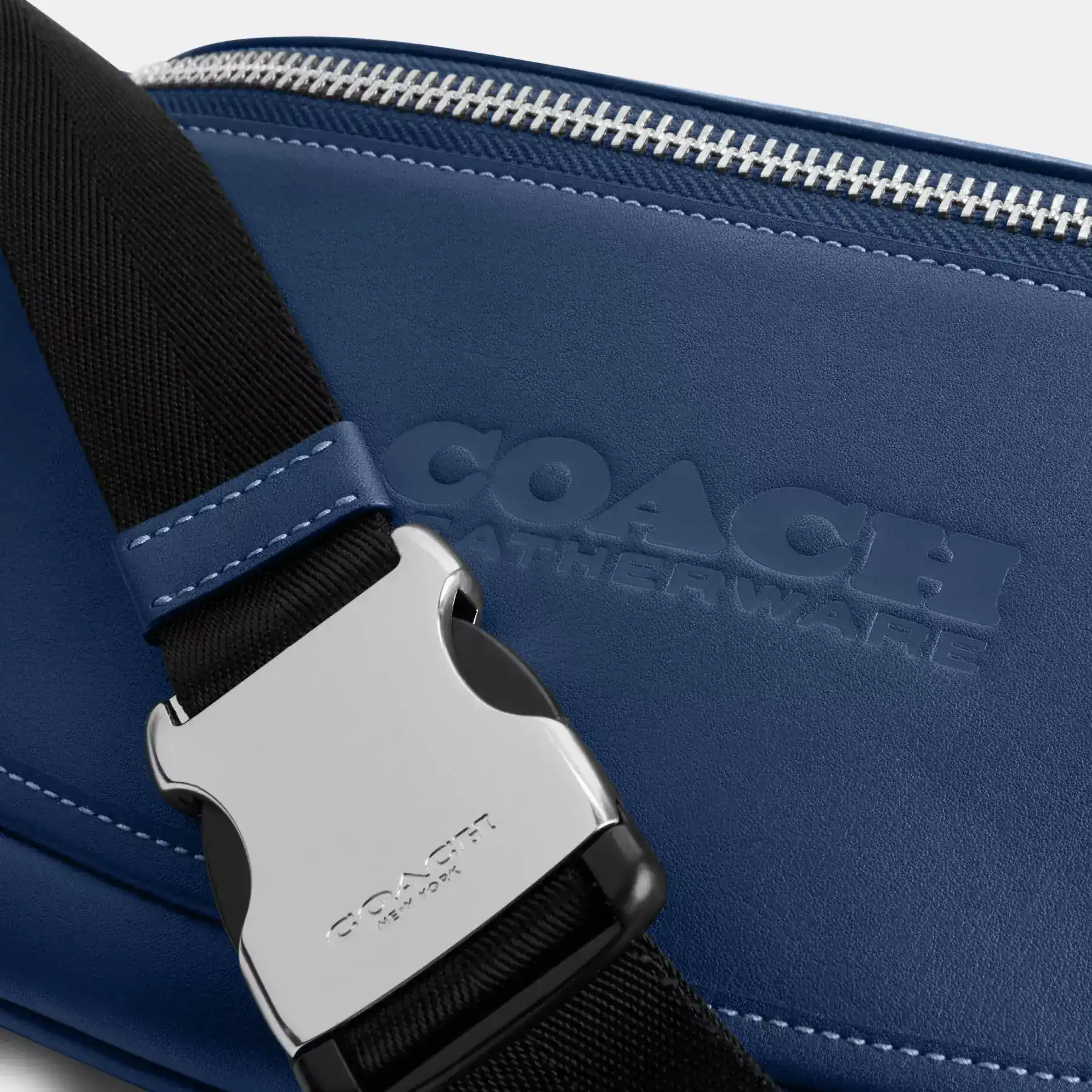 Made for a life in constant motion, the League keeps your game plan on track. Crafted of refined leather and debossed with our Coach graphic, this functional design keeps essentials close at hand. The sleek style features an inside multifunction pocket and a sporty seatbelt-style strap to wear crossbody or around the waist.