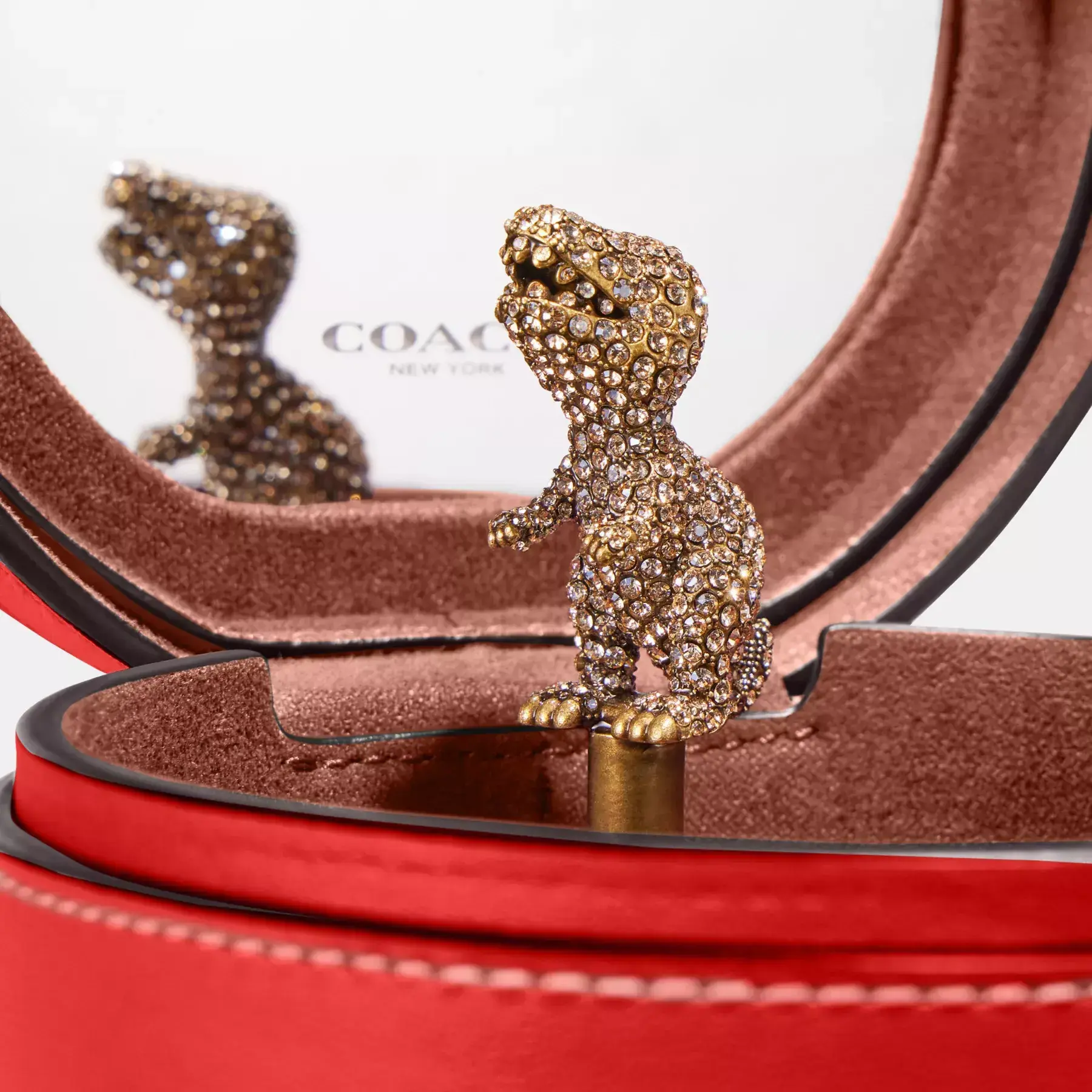 As a tribute to our heritage, this nostalgic jewelry box has been reimagined through our original spirit. Made of our iconic glovetanned leather and secured with a turnlock closure, it opens to reveal a spinning Rexy (our Coach mascot) adorned with pave crystals. She playfully dances to Tchaikovsky’s “Waltz of the Flowers.” Packaged in a box, this collectible gift is the perfect way to store the most memorable keepsakes.