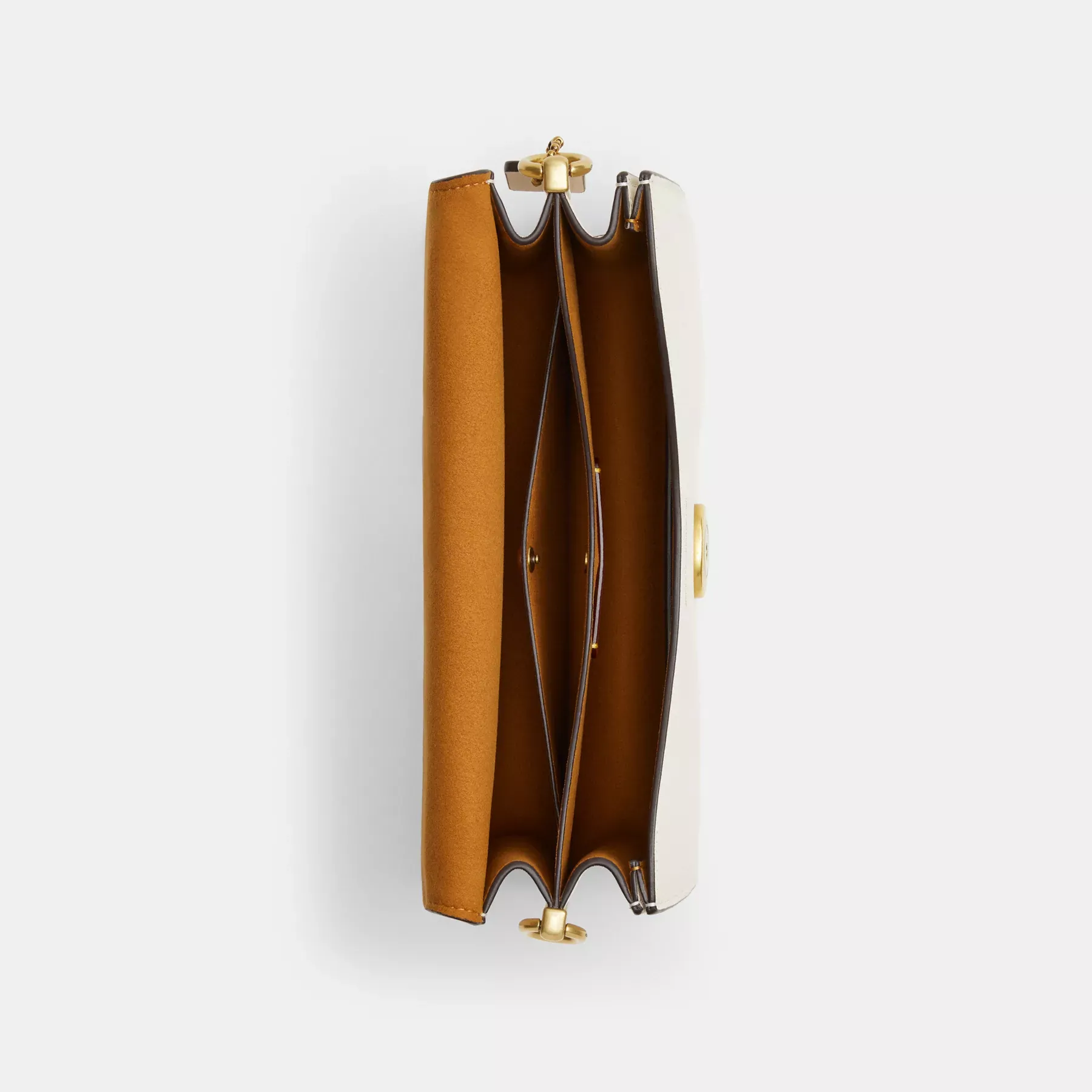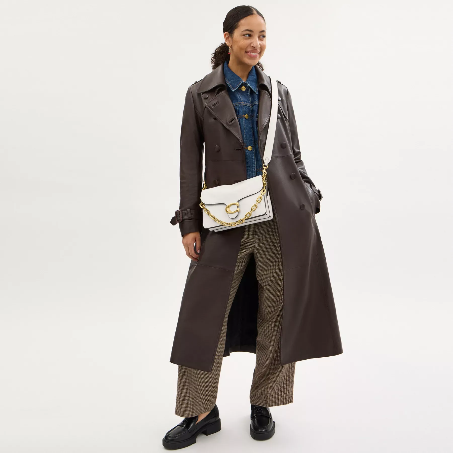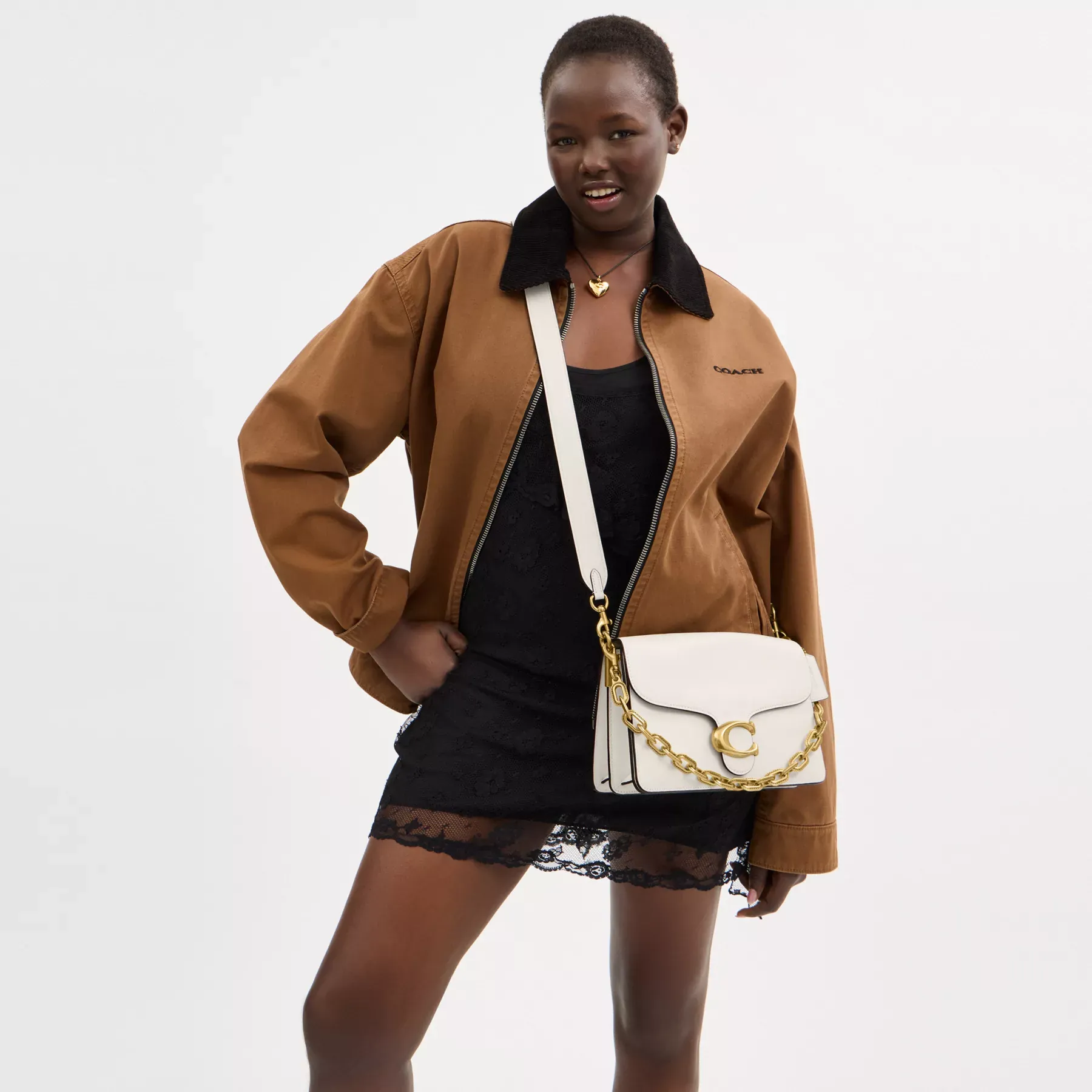 A modern take on an archival 1970s Coach design, our structured Chain Tabby shoulder bag is crafted of drapey soft grain leather with a subtle sheen. Finished with our Signature hardware for an iconic touch, the compact style has space for all the essentials, inside multifunction organizational pockets and a convenient outside zip pocket for easy access items. The versatile design is finished with three detachable straps to carry by hand, wear snug on the shoulder with the elegant stitched chain-link strap and short leather strap or go hands-free with the long leather crossbody strap.