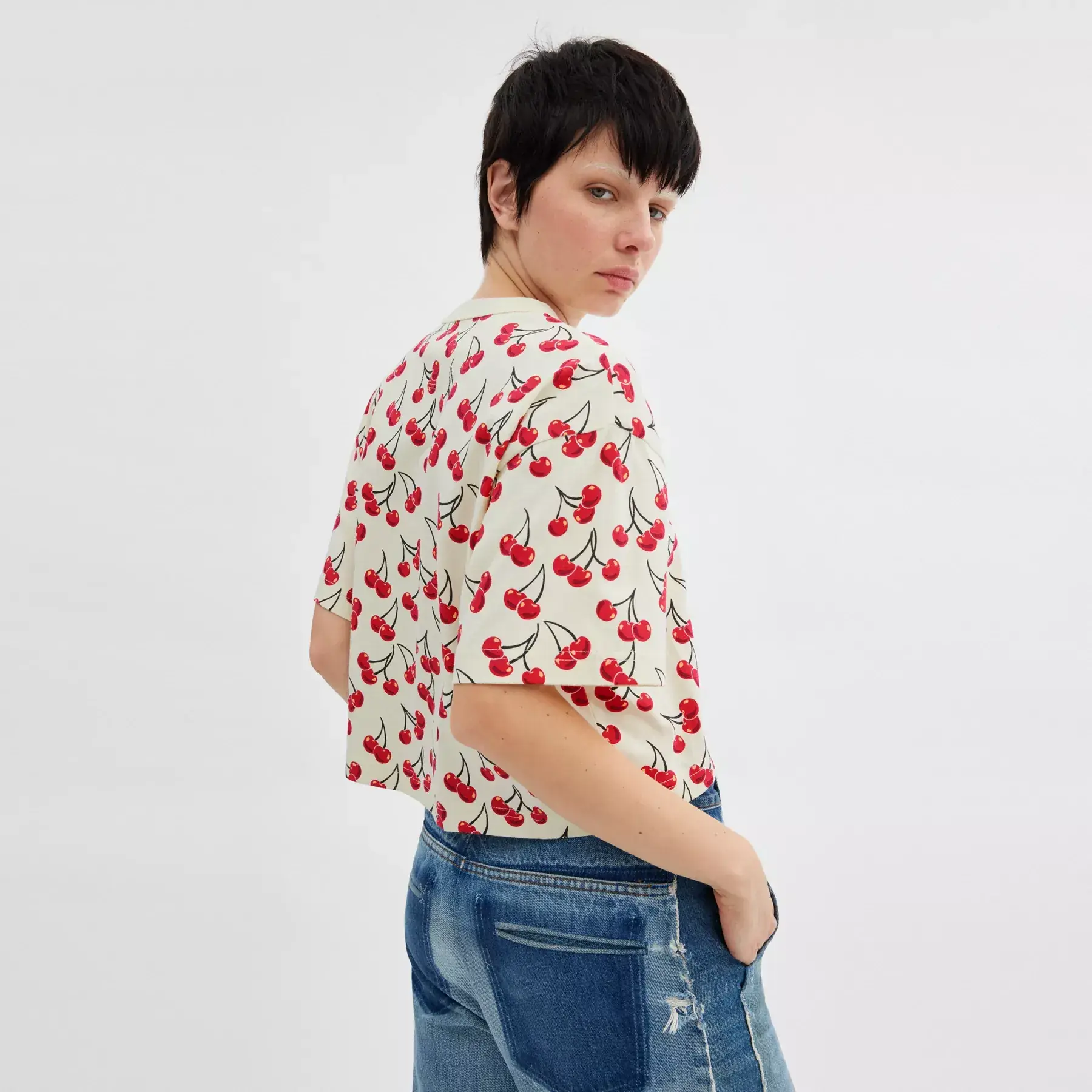 ,Detailed with our cursive Coach script and cheerful cherry motif, this cropped T-shirt is crafted of organic cotton made without the use of harmful chemical fertilizers and pesticides. The boxy silhouette features a comfortable, easy-to-wear dropped shoulder.