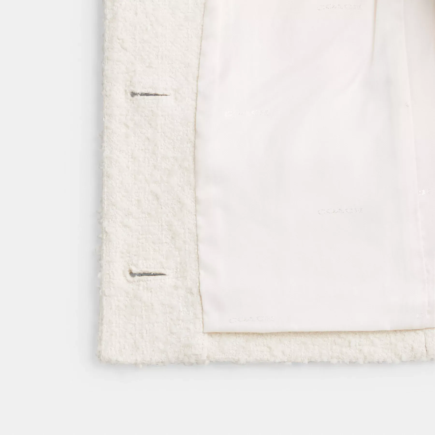 ,A modern take on a classic style, this vest is crafted of a lightweight cotton-blend boucle. The collarless design is finished with brass-rimmed buttons and patch pockets detailed with our Heritage C Plaque.