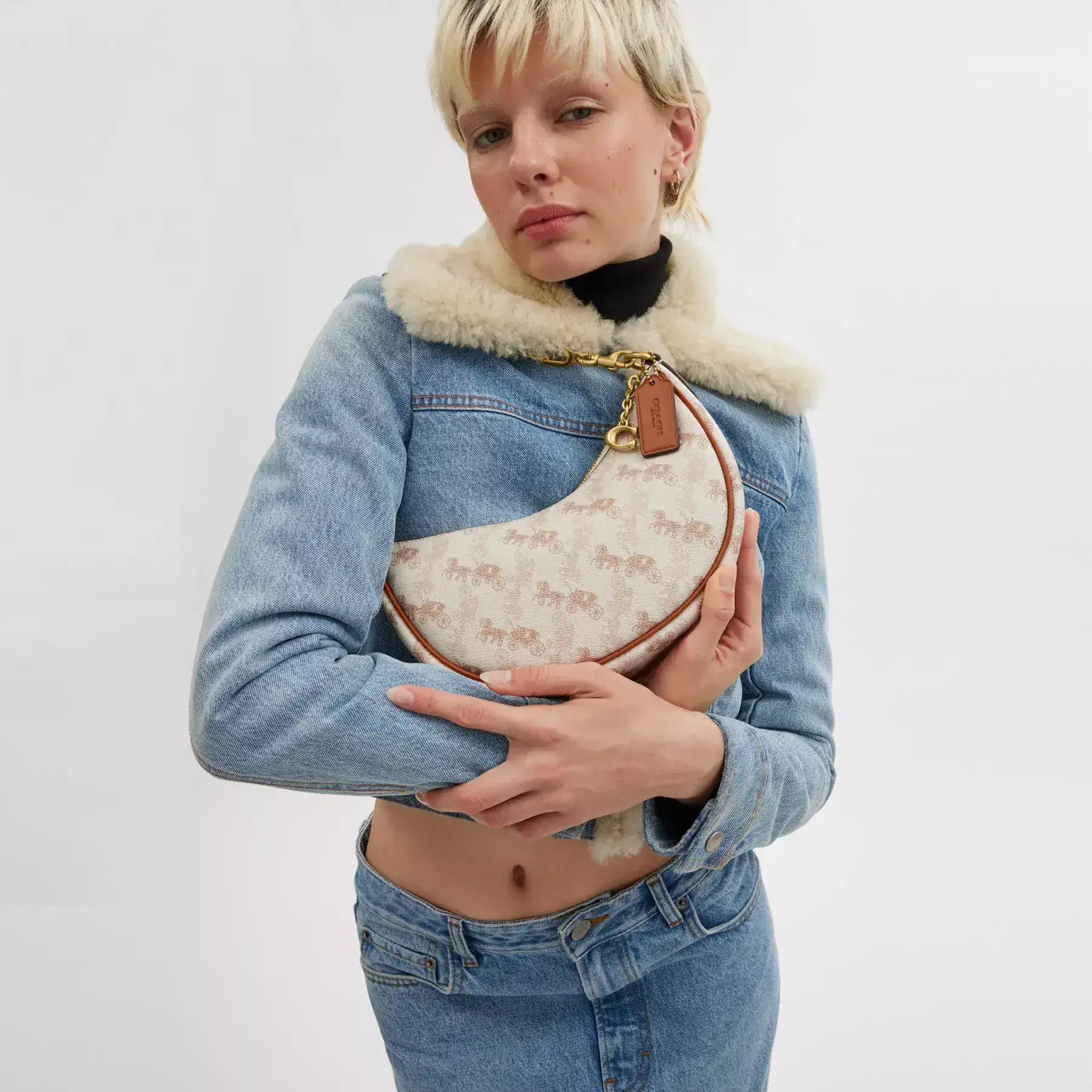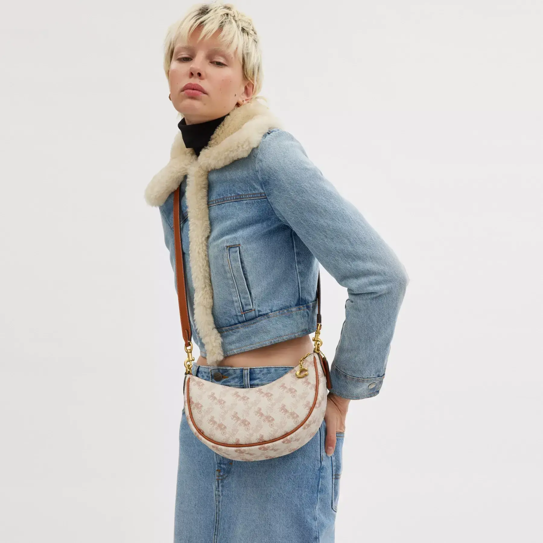 Soft and spacious, our crescent-shaped Mira is ahead of the curve. The versatile style is crafted of refined leather and sturdy coated canvas featuring our iconic Horse and Carriage motif. Finished with a secure zip-top closure detailed with our C hardware, it comes with a chunky chain-link shoulder strap and a detachable leather strap for crossbody wear. (Explore the possibilities.)