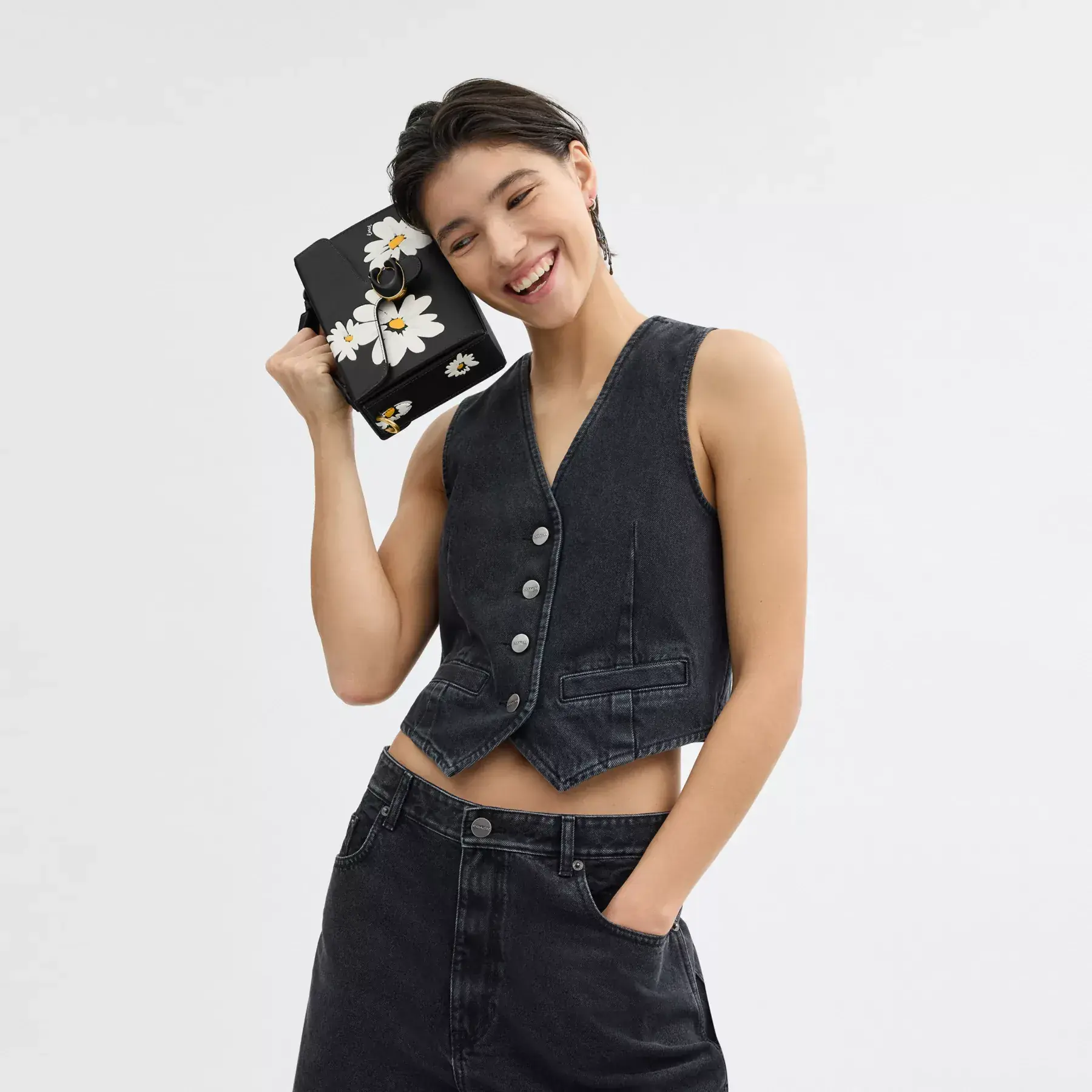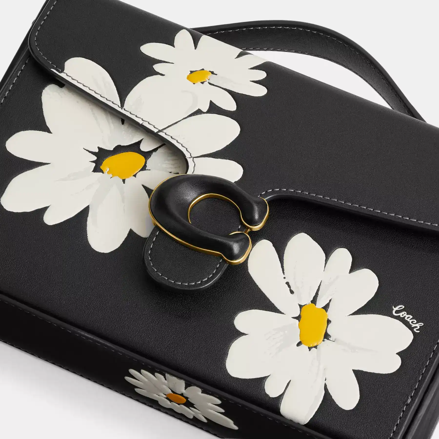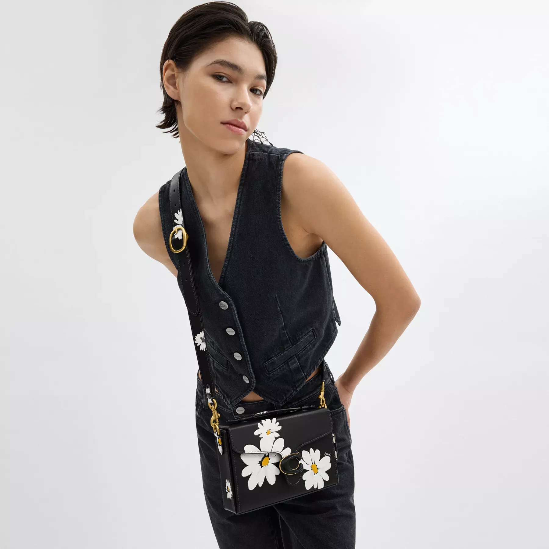 A modern take on an archival 1970s Coach design, our structured geometric Tabby box bag is crafted of buttery soft glovetanned leather featuring a dramatic daisy motif. Finished with tonal Signature hardware for an iconic touch, it has an expandable accordion opening for a little extra room when needed. The convenient convertible sporty style can be worn four ways: as a wristlet, held by the top handle, slung on the shoulder or crossbody with the detachable adjustable strap.