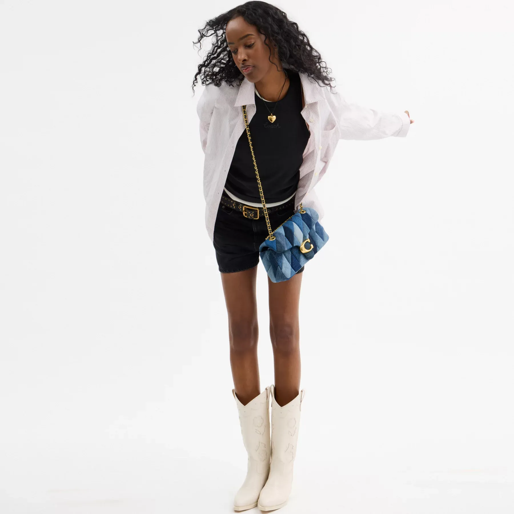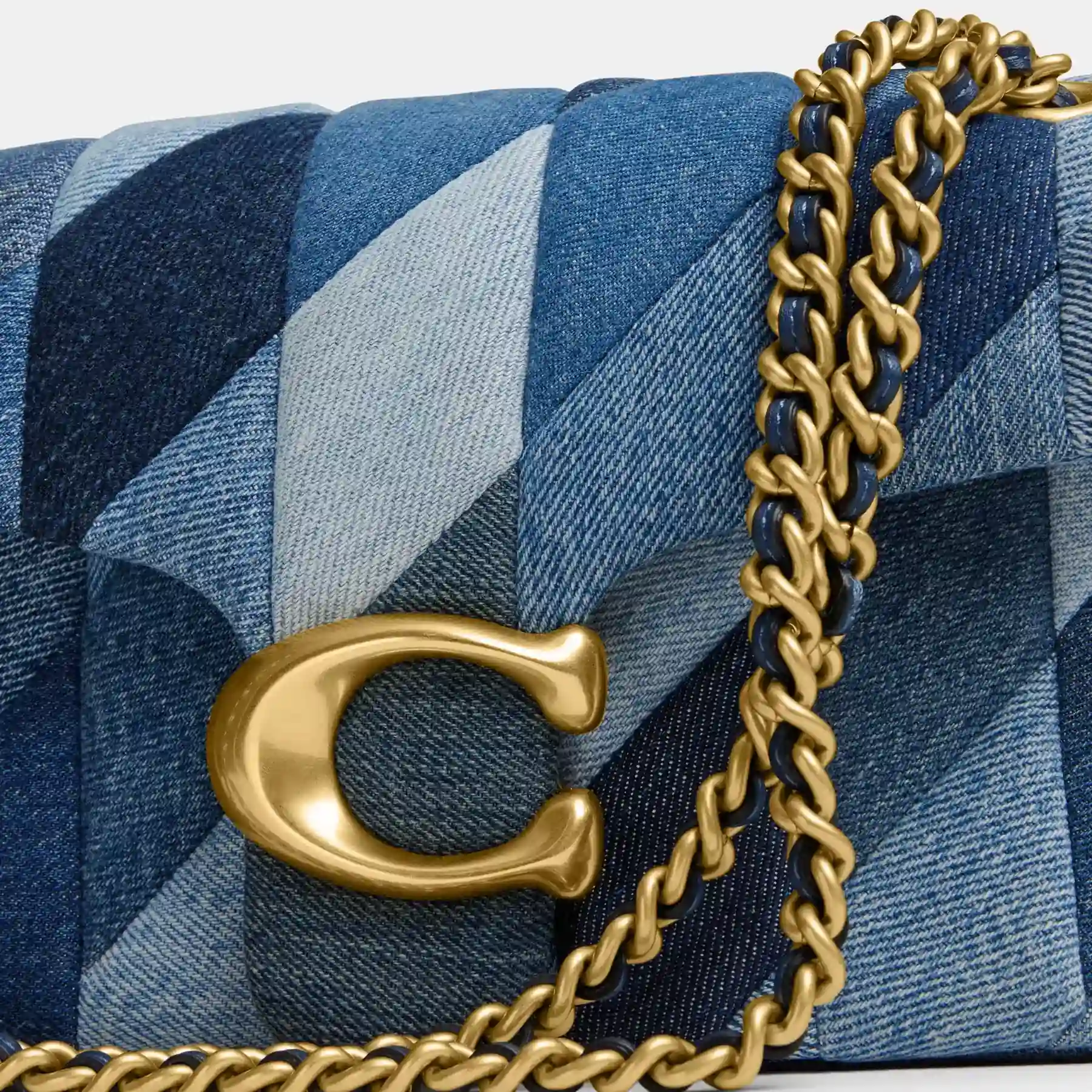 A modern take on an archival 1970s Coach design, our structured Tabby shoulder bag is crafted of a quilted mosaic patchwork of beautifully loveworn repurposed denim inspired by the endless possibilities of secondhand garments and our commitment to reducing our impact on the planet. Finished with leather details and our Signature hardware for an iconic touch, the compact 26 features a long leather chain strap to wear crossbody or double up for a shorter, dressier look.